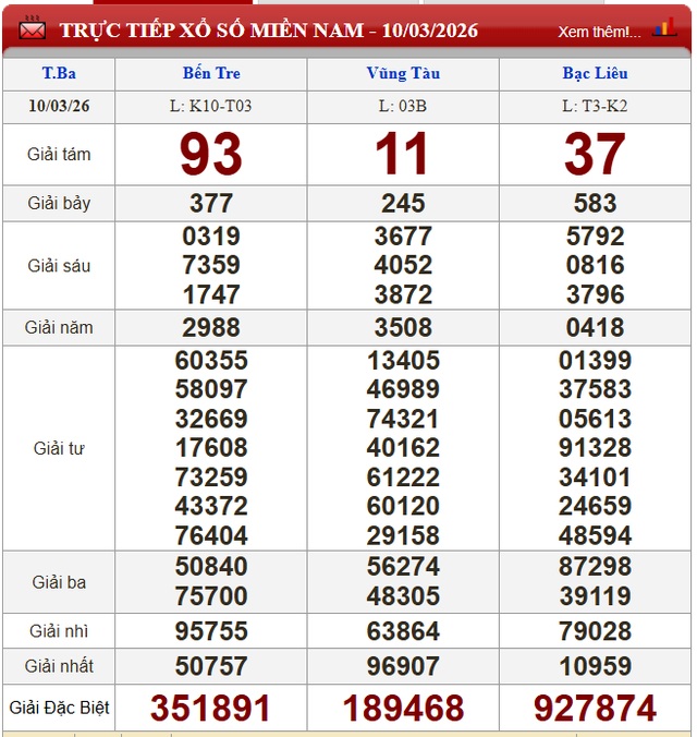 Kết quả xổ số miền Nam ngày 10/3/2026