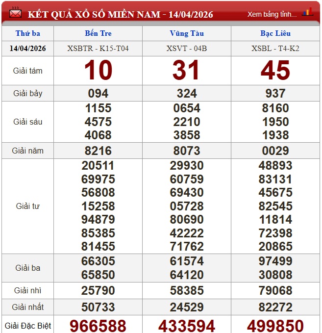Kết quả xổ số miền Nam ngày 14/4/2026