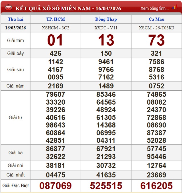 Kết quả xổ số miền Nam ngày 16/3/2026
