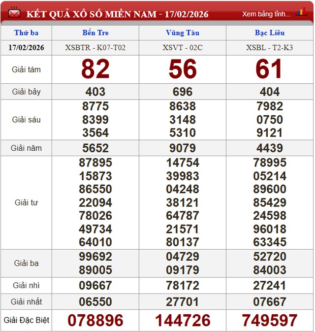 Kết quả xổ số miền Nam ngày 17/2/2026