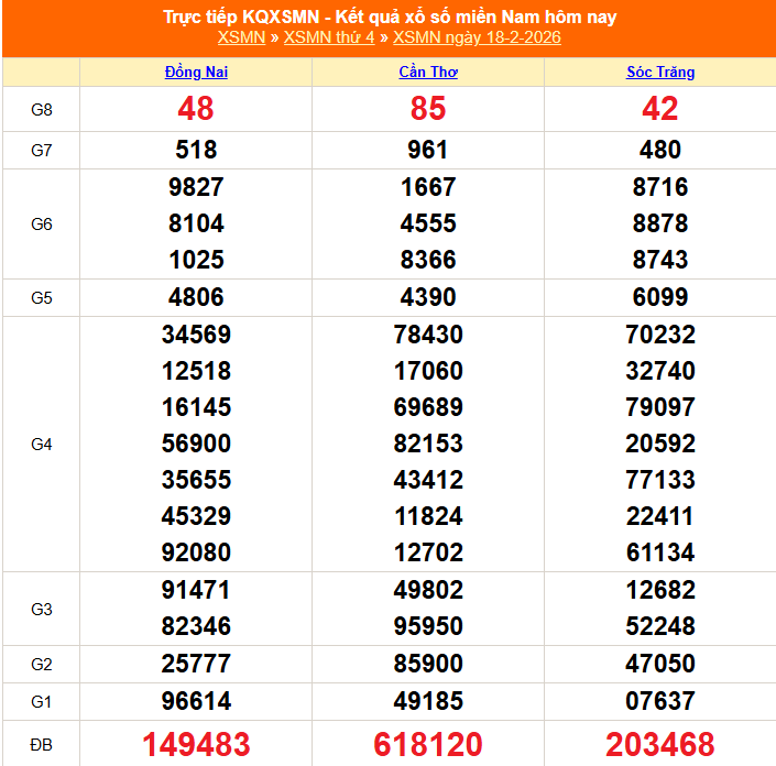 Kết quả xổ số miền Nam ngày 18/2/2026