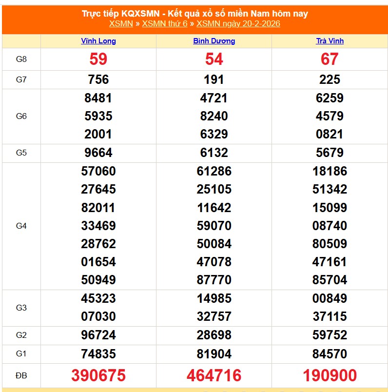 Cập nhật Kết quả xổ số miền Nam hôm nay 20/02/2026 - XSMN 20/02/2026 nhanh và chính xác nhất tới quý độc giả.