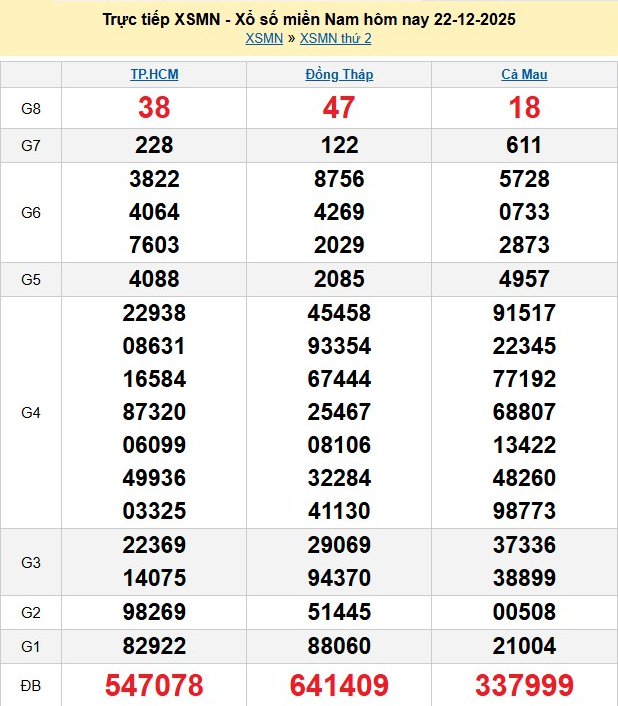 Kết quả xổ số miền Nam ngày 22/12/2025