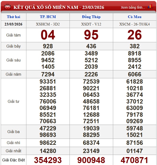 Kết quả xổ số miền Nam ngày 23/3/2026