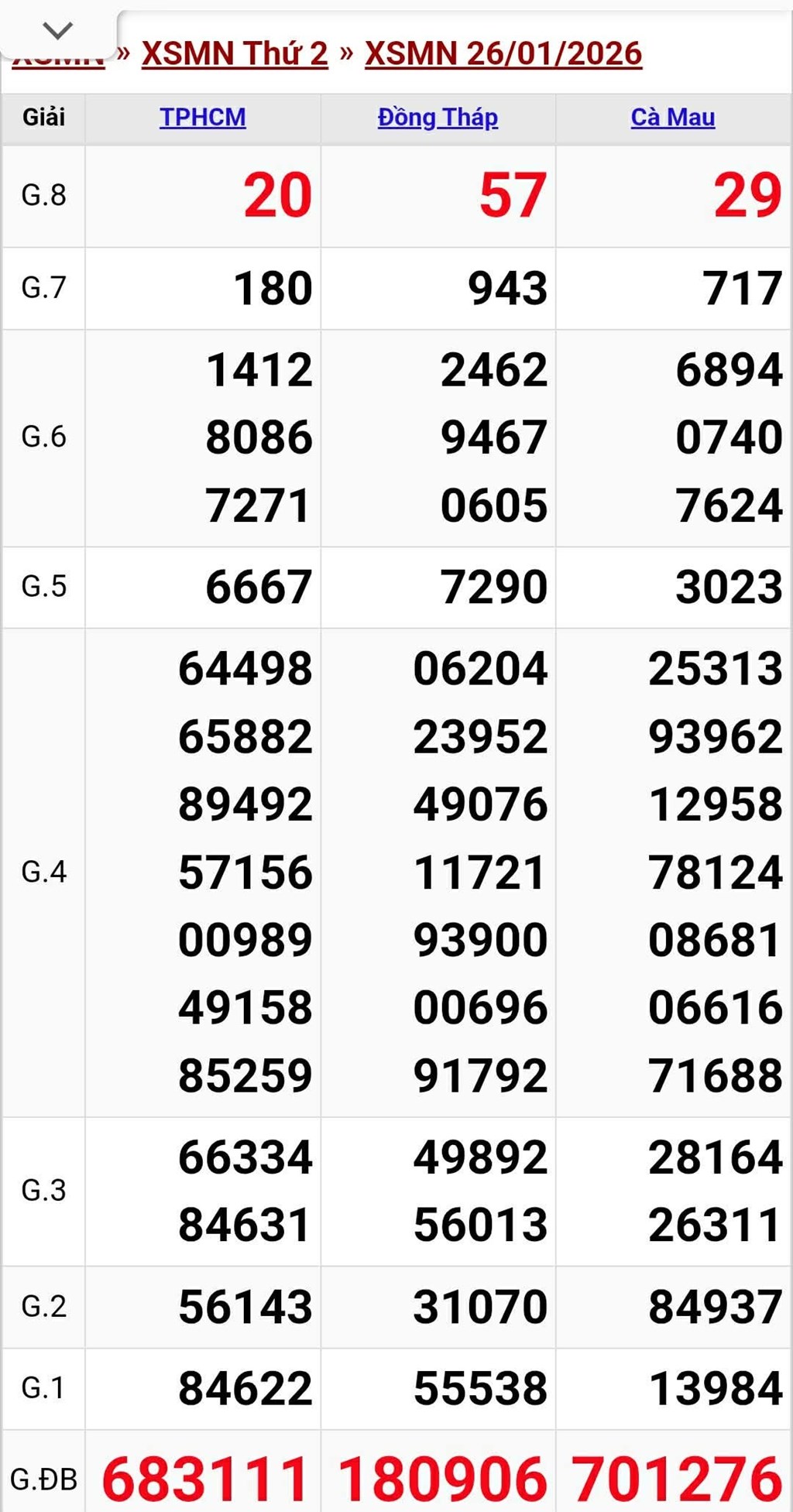 Kết quả xổ số miền Nam ngày 26/1/2026
