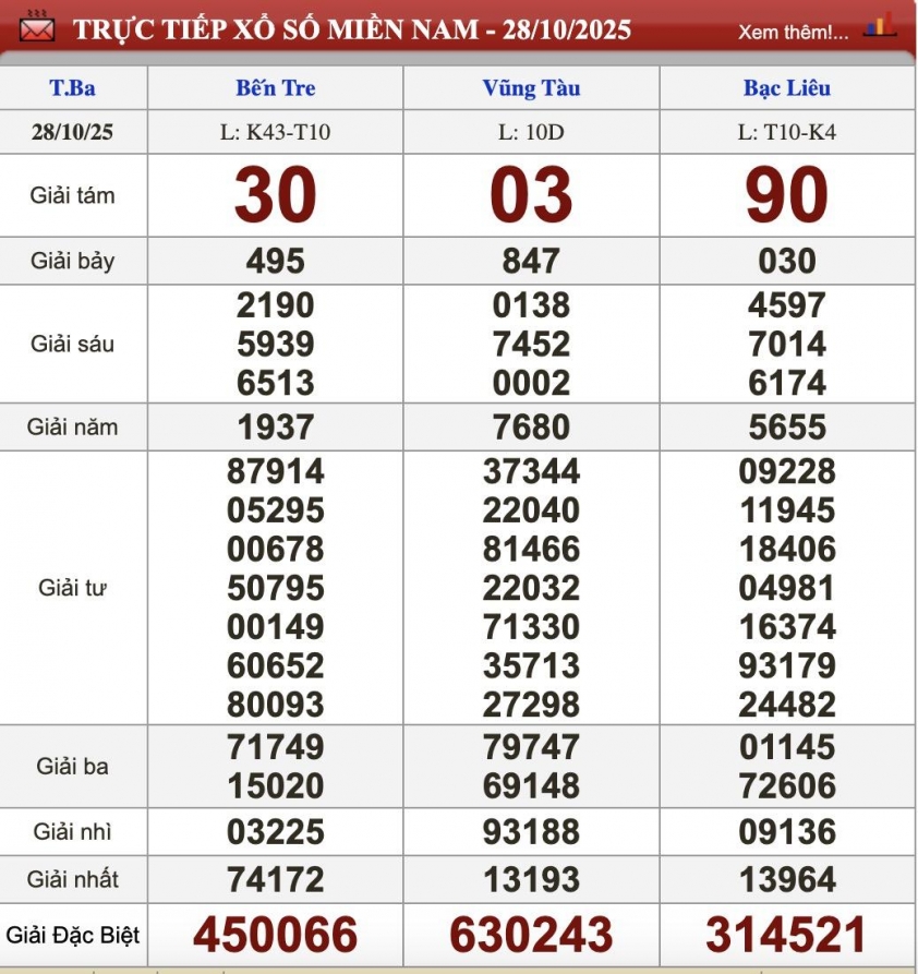 Cập nhật kết quả xổ số miền Nam hôm nay 28/10/2025 nhanh nhất và chính xác nhất. Theo dõi kết quả XSMN Thứ Ba ngày 28/10 trên ldg.com.vn.