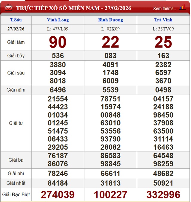 Kết quả xổ số miền Nam ngày 27/2/2026