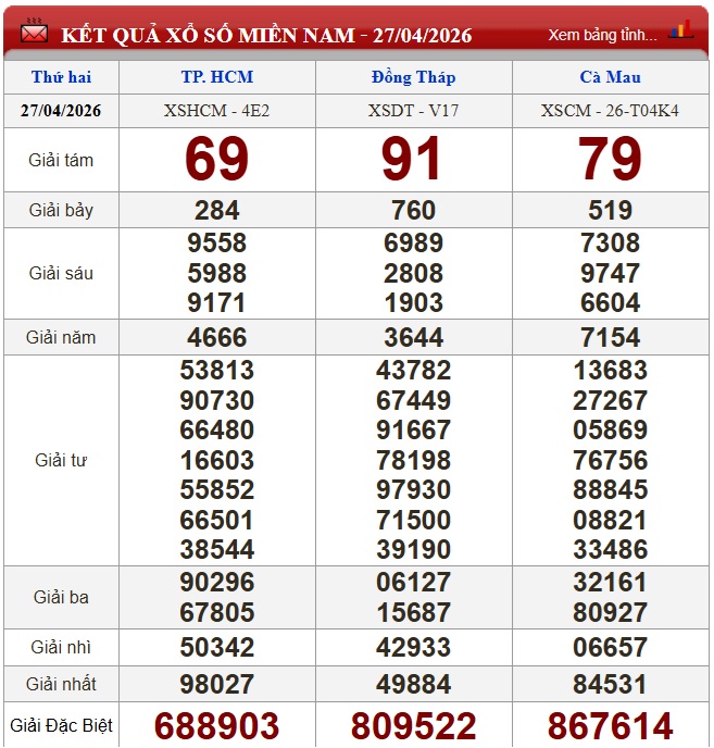 Kết quả xổ số miền Nam ngày 27/4/2026