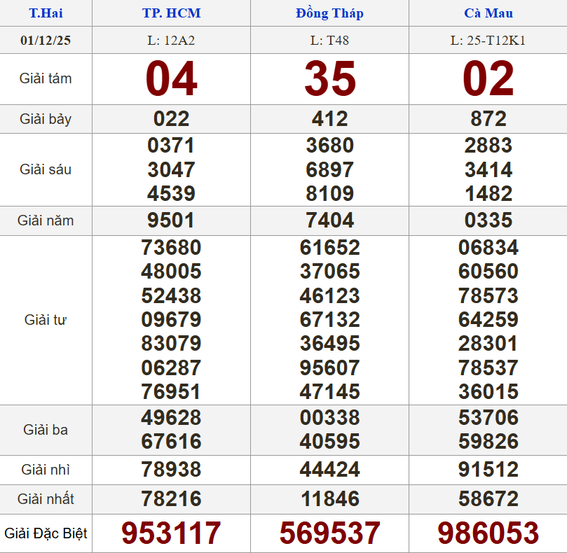 Kết quả xổ số miền Nam ngày 1/12/2025