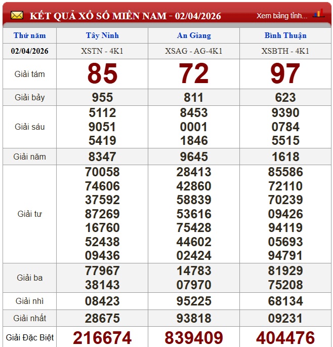 Kết quả xổ số miền Nam (XSMN) ngày 4/4 được quay trực tiếp từ giải 8 đến giải 1 và cuối cùng là công bố giải đặc biệt.