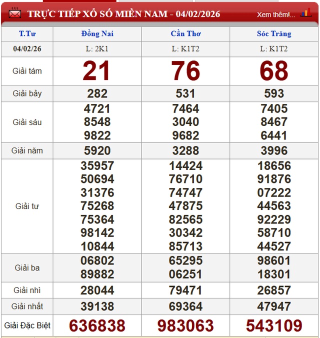 Kết quả xổ số miền Nam ngày 4/2/2026