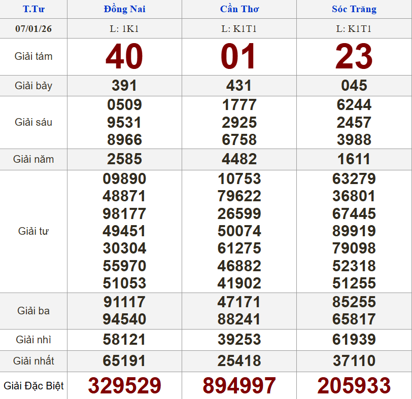 Kết quả xổ số miền Nam (XSMN) được thực hiện lúc 16 giờ 30 phút và được mở thưởng bởi Công ty xổ số kiến thiết Đồng Nai (XSĐN), Sóc Trăng (XSST), Cần Thơ (XSCT). Kết quả của đài nào sẽ được mở thưởng tại trường quay của tỉnh đó. Xổ số hôm nay - KQXSMN ngày 7/1 được quay thưởng bắt đầu từ giải tám cho đến giải nhất, cuối cùng là công bố kết quả giải đặc biệt.