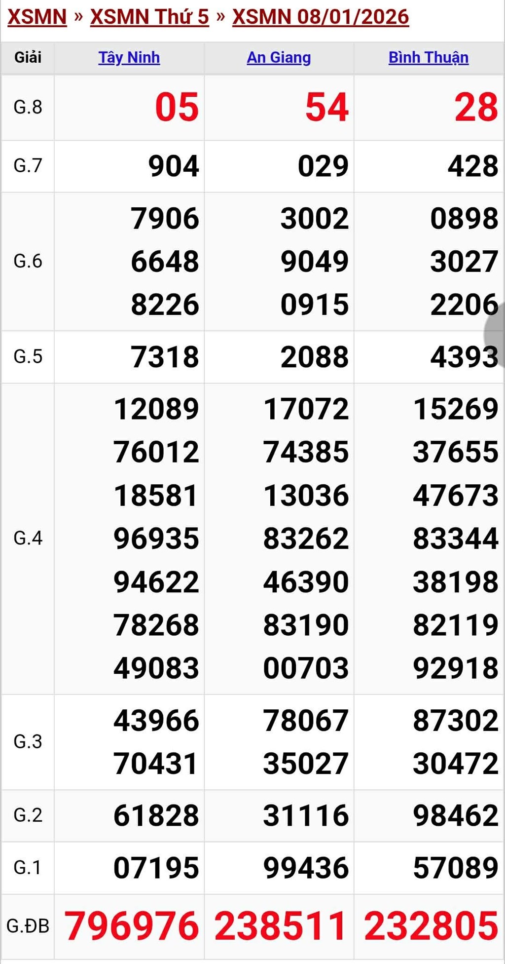 Kết quả xổ số miền Nam ngày 8/1/2026