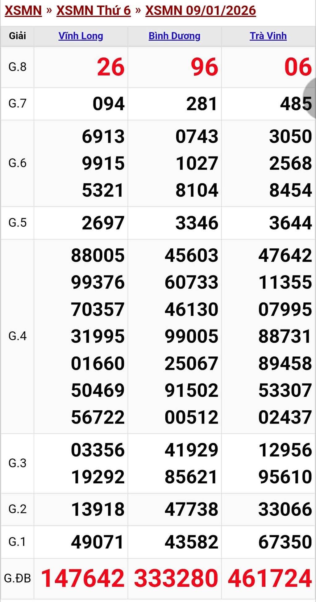 Kết quả xổ số miền Nam (XSMN) được thực hiện lúc 16 giờ 30 phút và được mở thưởng bởi Công ty xổ số kiến thiết Vĩnh Long (XSVL), Trà Vinh (XSTV), Bình Dương (XSBD). Kết quả của đài nào sẽ được mở thưởng tại trường quay của tỉnh đó. Xổ số hôm nay - KQXSMN ngày 9/1 được quay thưởng bắt đầu từ giải tám cho đến giải nhất, cuối cùng là công bố kết quả giải đặc biệt.