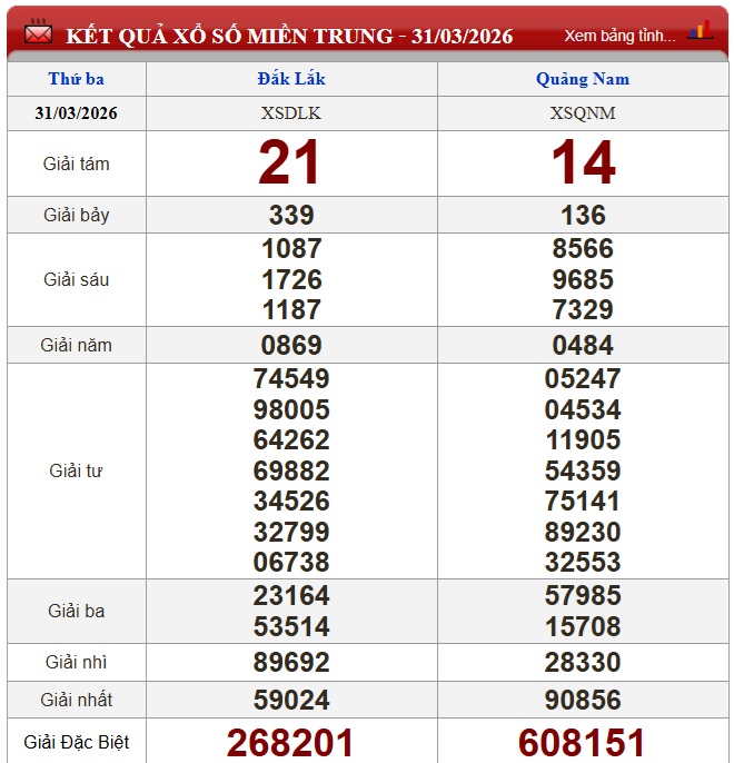Kết quả xổ số miền Trung ngày 31/3/2026