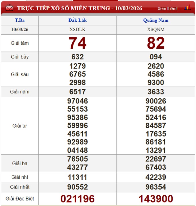 Kết quả xổ số miền Trung ngày 10/3/2026