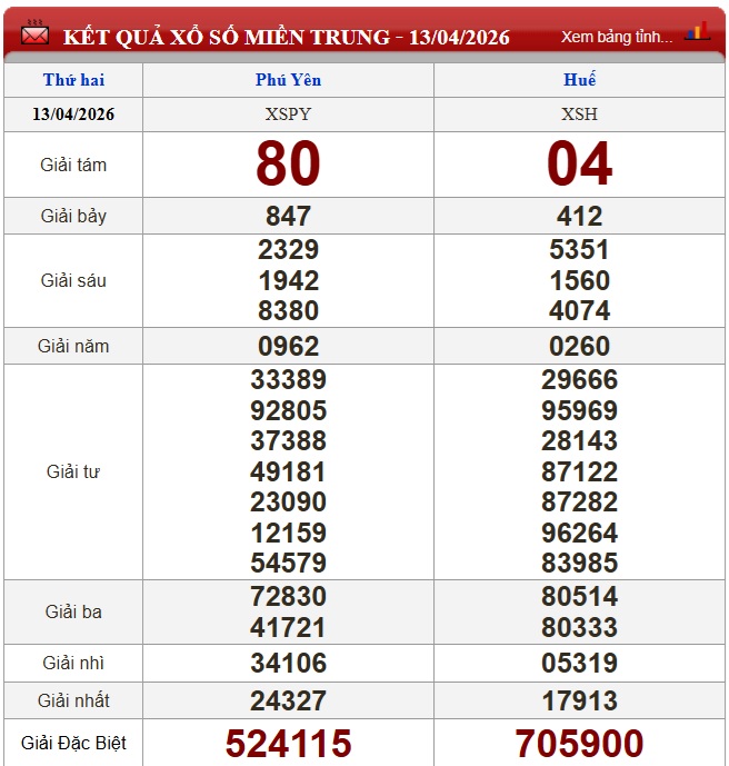 Kết quả xổ số miền Trung (XSMT) ngày 13/4