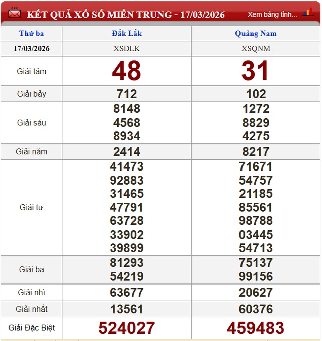 Kết quả xổ số miền Trung ngày 17/3/2026