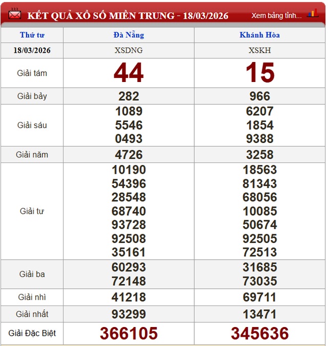 Kết quả xổ số miền Trung ngày 18/3/2026