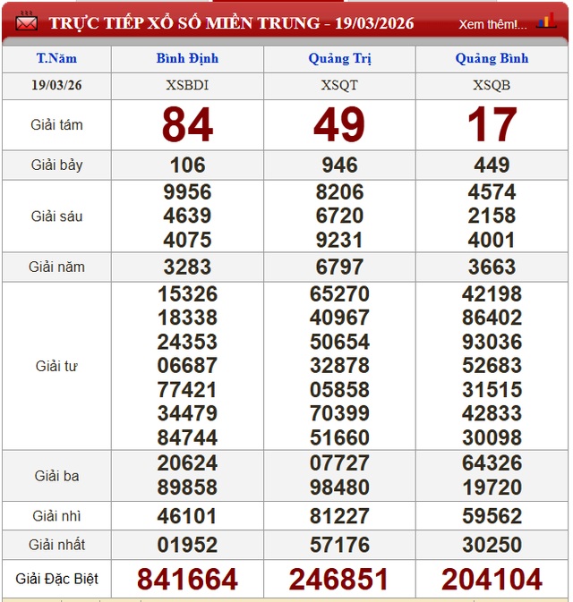 Kết quả xổ số miền Trung (XSMT) hôm nay ngày 19/3