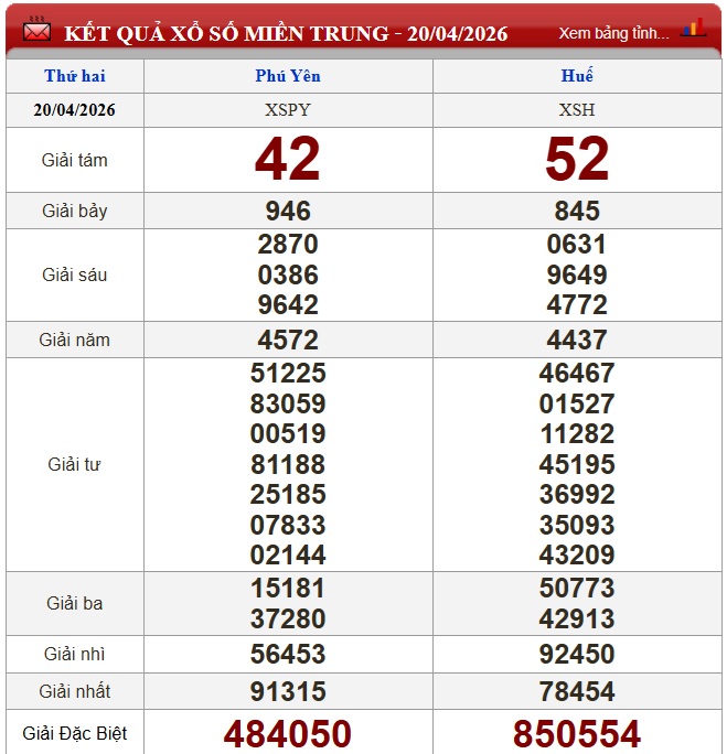 Kết quả xổ số miền Trung (XSMT) ngày 20/4