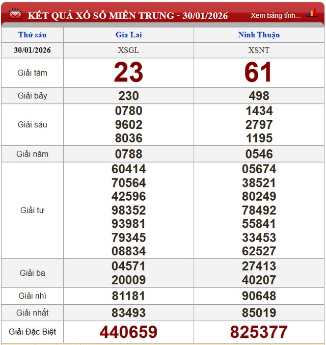 Kết quả xổ số miền Trung ngày 30/1/2026