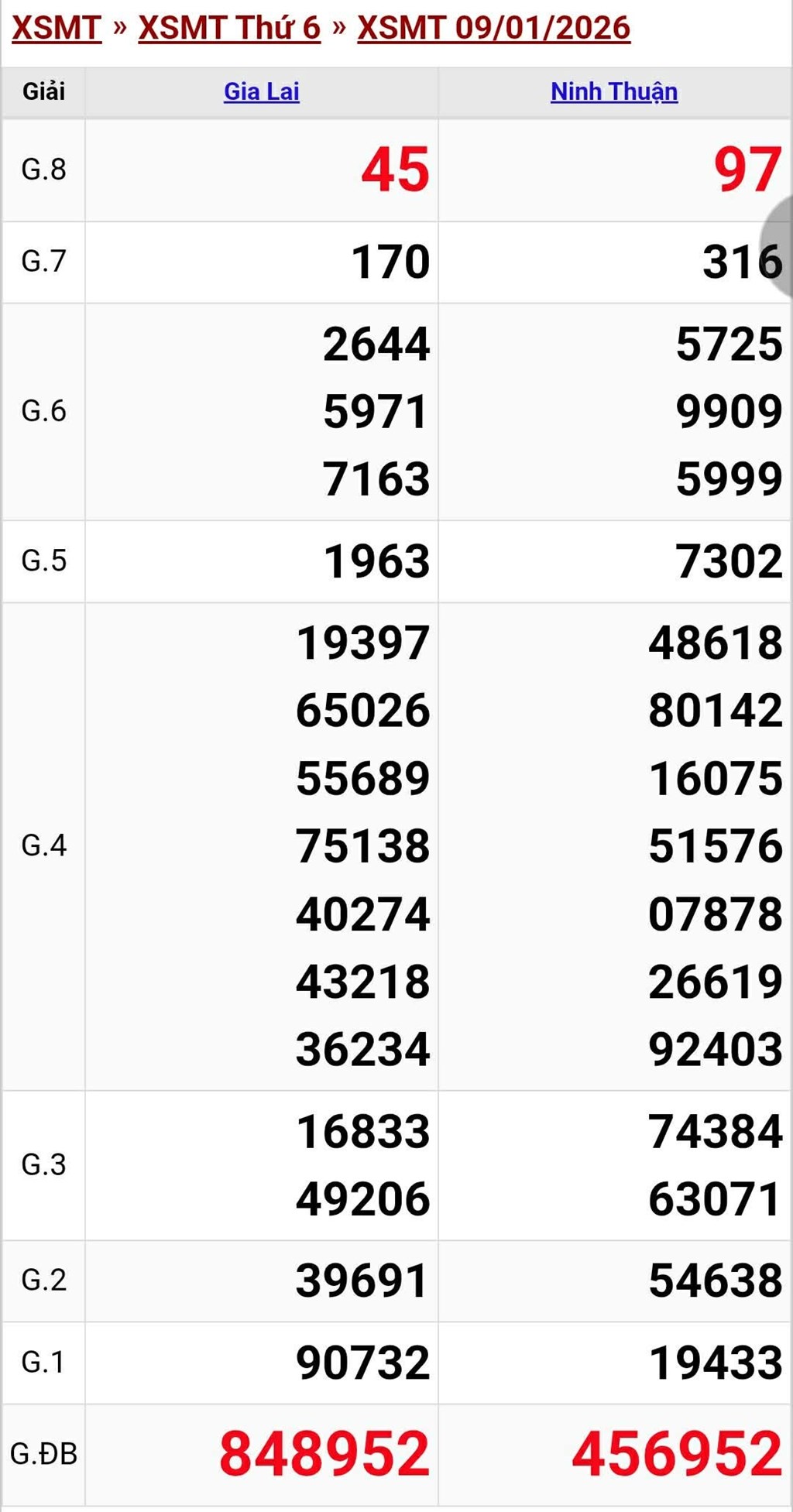 Kết quả xổ số miền Trung (XSMT) được thực hiện lúc 16 giờ 30 phút và được mở thưởng bởi Công ty xổ số kiến thiết của tỉnh Gia Lai (XSGL) và Ninh THuận (XSNT). Kết quả của đài nào sẽ được mở thưởng tại trường quay của tỉnh đó. Xổ số hôm nay - KQXSMT ngày 9/1 được quay thưởng bắt đầu từ giải tám cho đến giải nhất, cuối cùng là công bố kết quả giải đặc biệt.