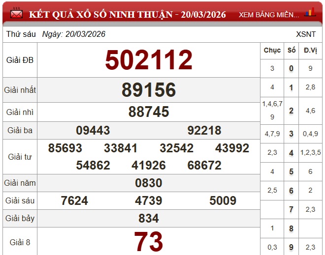 Kết quả xổ số Ninh Thuận hôm nay ngày 20/3/2026 quay thưởng lúc 17h15. Các giải thưởng XSNT được công bố lần lượt từ giải tám đến giải nhất và cuối cùng là giải đặc biệt.