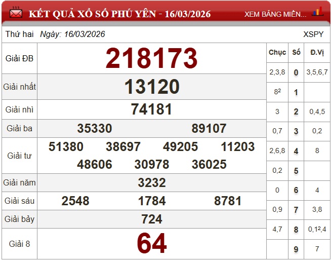 - XSPY 16/3, kết quả xổ số Phú Yên ngày 16/3/2026