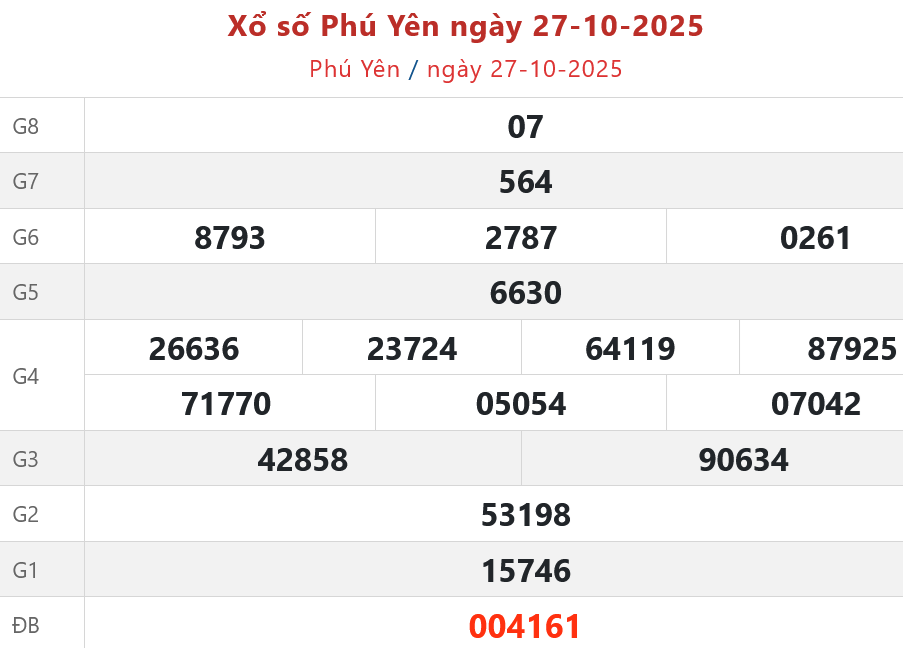 Kết quả xổ số Phú Yên hôm nay ngày 27/10/2025 được quay thưởng vào lúc 17h15 bởi Công ty TNHH MTV Xổ số kiến thiết Phú Yên. Kết quả các giải thưởng của XSPY 27/10/2025 được công bố lần lượt từ giải giải nhất cho đến giải tám, cuối cùng là giải đặc biệt.