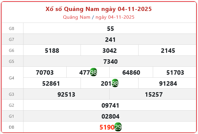 Theo dõi kết quả xổ số Quảng Nam hôm nay 4/11/2025 nhanh chóng và chính xác nhất để không bỏ lỡ thời gian nhận thưởng.