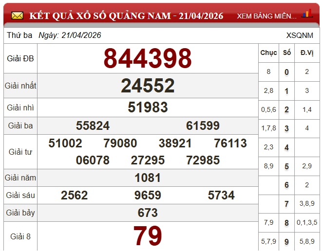 Kết quả xổ số quảng nam ngày 21/4/2026