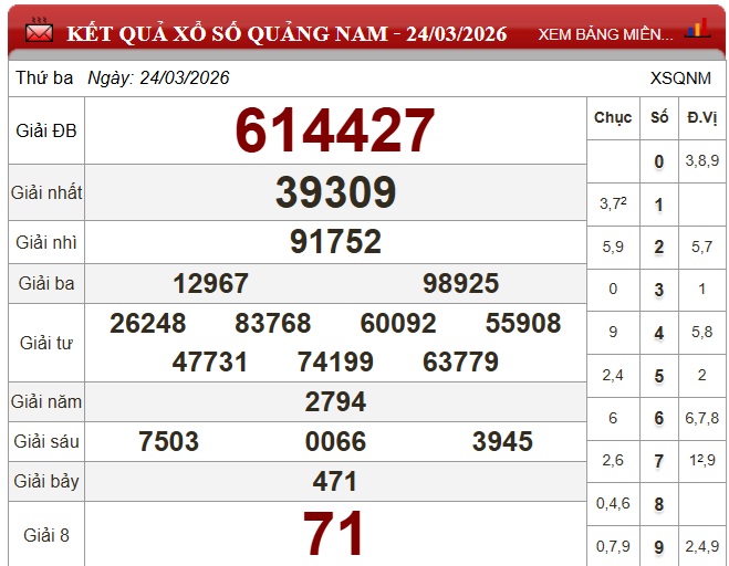 Kết quả xổ số quảng nam Thứ Ba ngày 24/3/2026