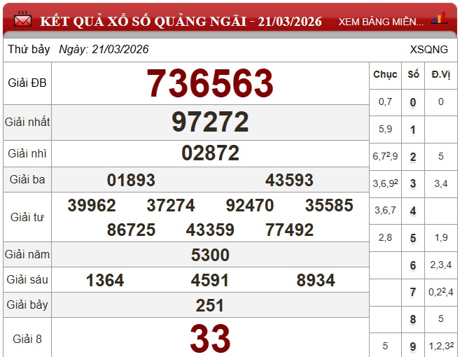 Kết quả xổ số Quảng Ngãi Thứ Bảy ngày 21/3/2026