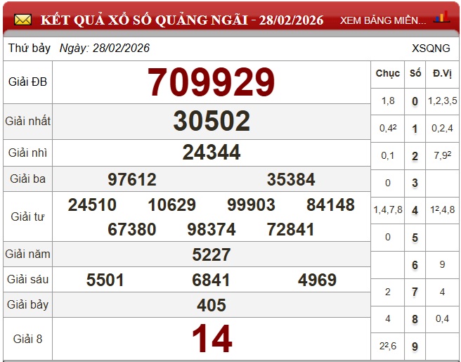 Kết quả xổ số Quảng Ngãi thứ Bảy ngày 21/2/2026