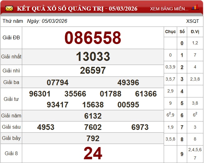 Kết quả xổ số Quảng Trị Thứ Năm ngày 5/3/2026