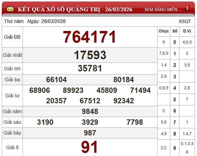 Kết quả xổ số Quảng Trị Thứ Năm ngày 26/3/2026