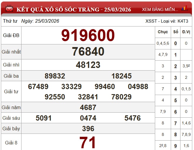 Kết quả xổ số Sóc Trăng Thứ Tư ngày 25/3/2026