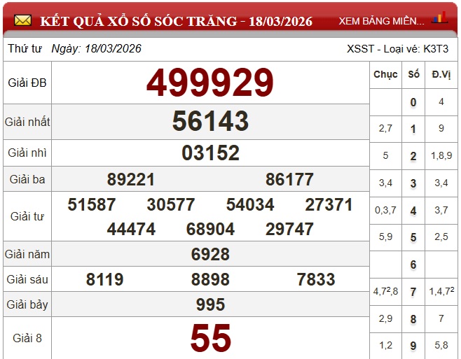 Kết quả xổ số Sóc Trăng Thứ Tư ngày 18/3/2026