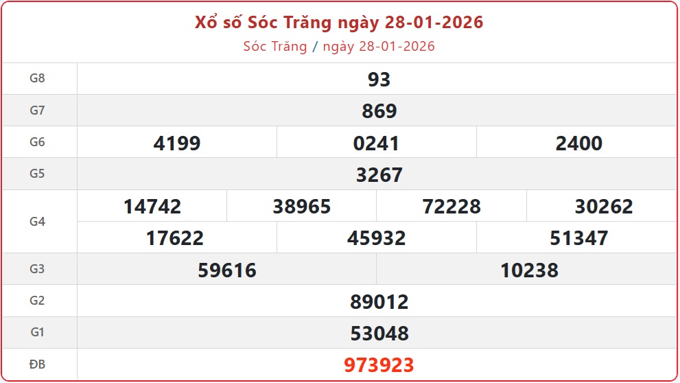 Theo dõi kết quả xổ số Sóc Trăng hôm nay 28/1/2026 nhanh chóng và chính xác nhất.