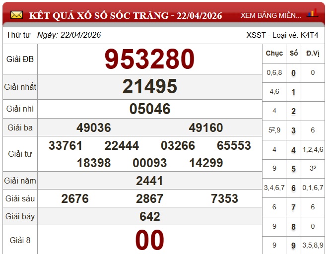Kết quả xổ số Sóc Trăng ngày 22/4/2026