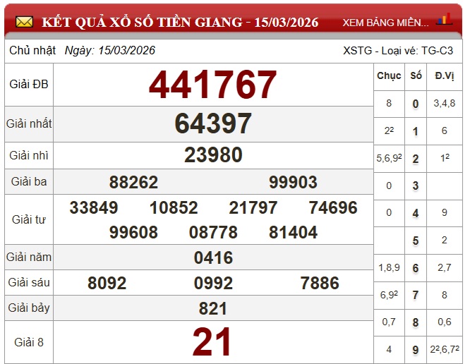- XSTG 15/3, kết quả xổ số Tiền Giang ngày 15/3/2026