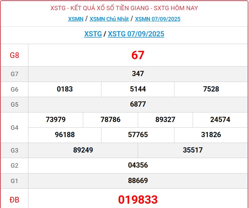 XSTG 7/9, Kết quả xổ số hôm nay ngày 7/9, XSTG Chủ nhật, Trực tiếp KQXSTG ngày 7/9, Kết quả xổ số Tiền Giang hôm nay ngày 7/9/2025.