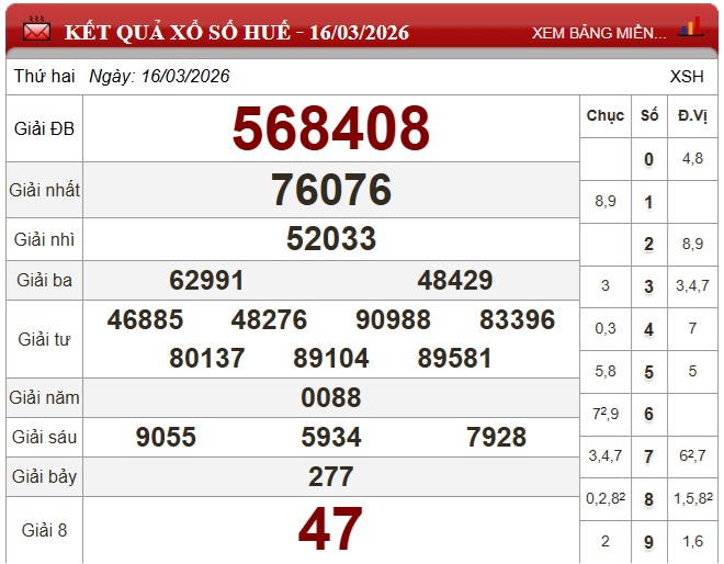 Theo dõi kết quả xổ số Huế hôm nay 16/3/2026 để cập nhật kết quả sớm nhất.