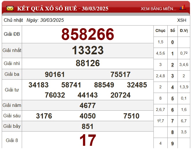 Kết quả xổ số Huế hôm nay 5/4/2026 do Công ty TNHH MTV Xổ số kiến thiết Huế quay số mở thưởng vào lúc 17h15. Kết quả XSTTH 5/4/2026 sẽ công bố lần lượt từ giải tám cho đến giải nhất, cuối cùng là giải đặc biệt.