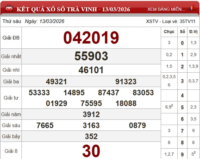 Kết quả Xổ số Trà Vinh Thứ Sáu ngày 13/3/2026