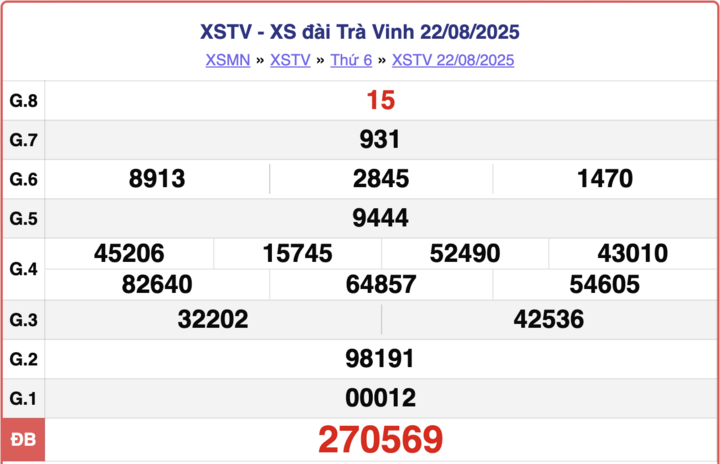 Trực tiếp Kết quả xổ số Bình Dương hôm nay - Kết quả XSTV 22/8- XSTV hôm nay Thứ Sáu ngày 22/8/2025 - Xổ số Trà Vinh hôm nay thứ Sáu ngày 22/8/2025