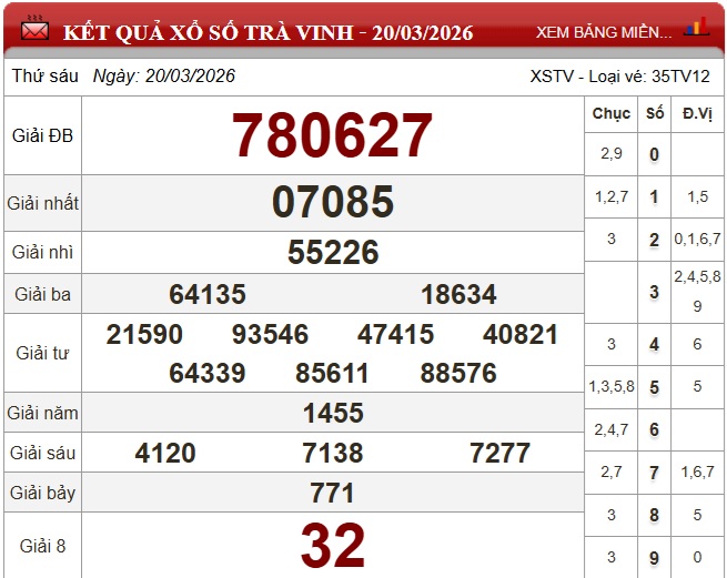 Theo dõi kết quả xổ số Trà Vinh hôm nay 27/3/2026 nhanh chóng và chính xác nhất để không bỏ lỡ thời gian nhận thưởng.