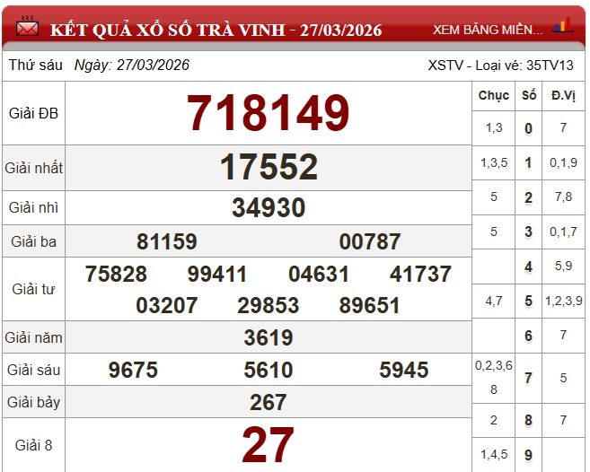 Kết quả Xổ số Trà Vinh Thứ Sáu ngày 27/3/2026