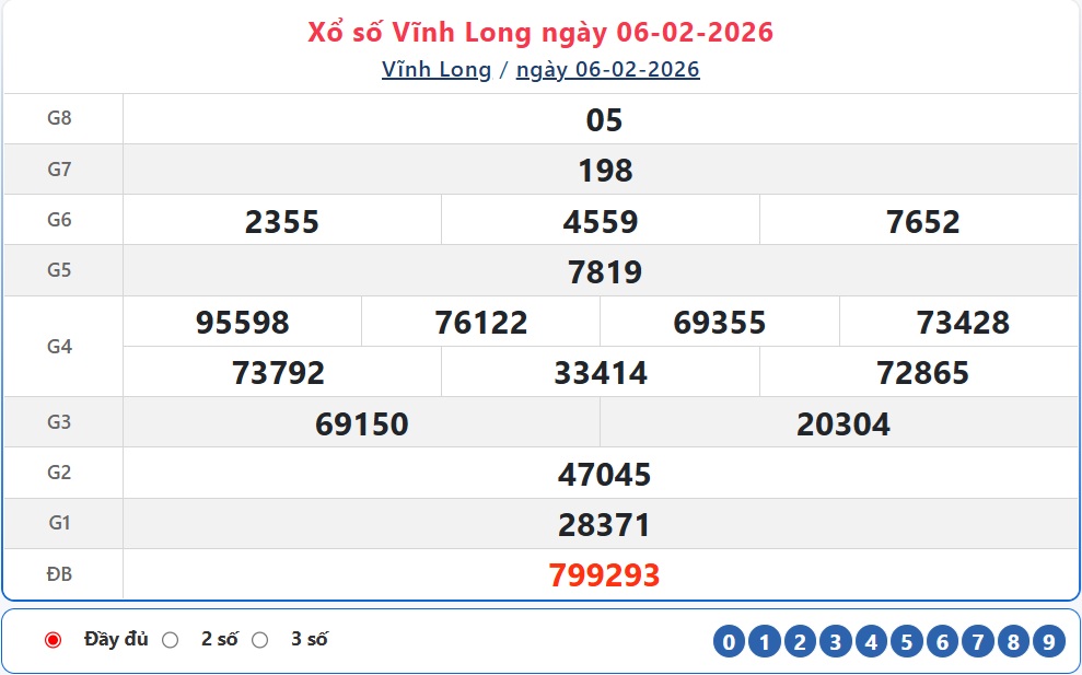 Kết quả xổ số Vĩnh Long ngày 6/2/2026
